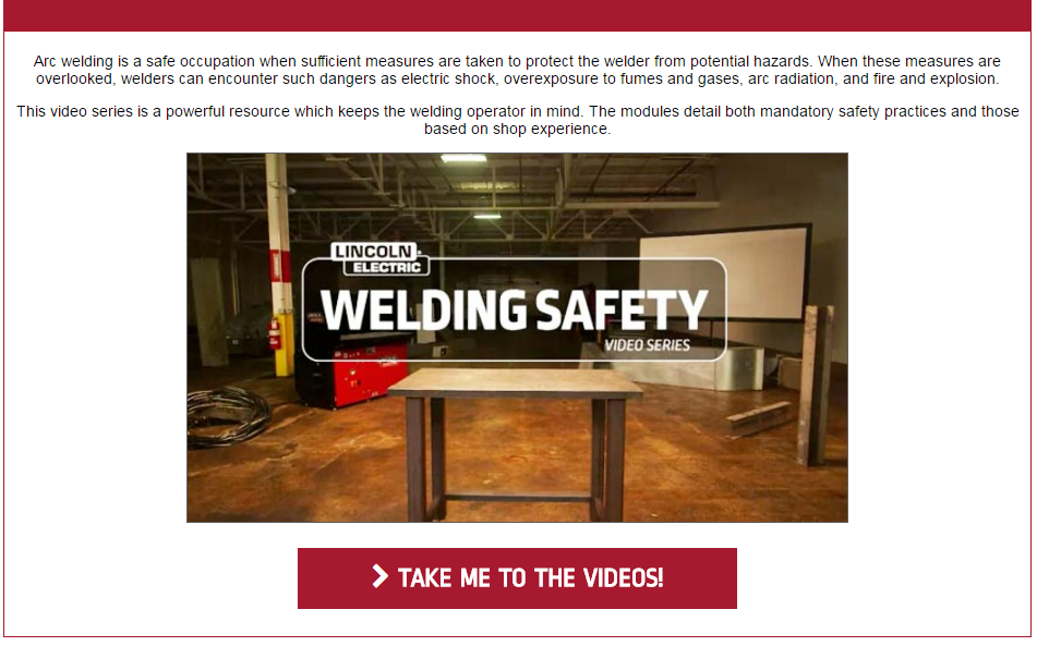 Click on the image below to view the entire range of Lincoln Electric safety information! A full welding educational video course is available along with safety requirements for each product.